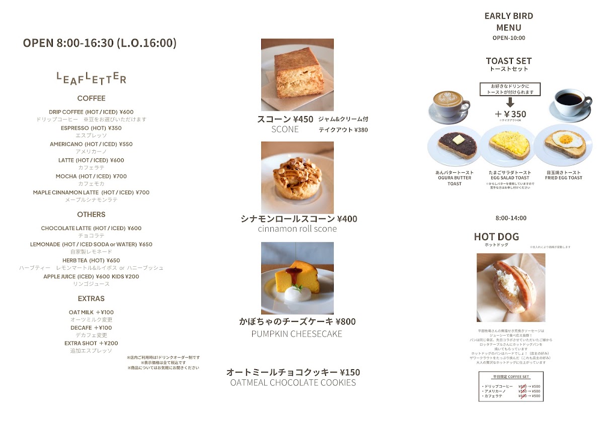 LEAFLETTER is particularly renowned for its high-quality coffee, featuring a range of options that cater to diverse tastes. Indulge in a cup of Drip Coffee where you can select from carefully sourced beans, priced at just JP¥600. For those who crave a more intense flavor, the Espresso (JP¥350) is a must-try. If you prefer something creamier, the Latte and Mocha (JP¥600 and JP¥700, respectively) are crafted with precision and passion, delivering a rich, satisfying experience. One standout is the Maple Cinnamon Latte, which combines the warmth of maple with the spice of cinnamon for a comforting drink that is both sweet and aromatic.